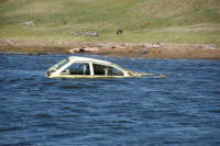 hat Angst, dass der Wagen kippt, aber nichts passiert. Am Ufer steht ein dunkler PKW, wahrscheinlich ein Fischer.