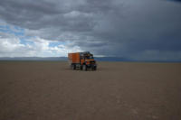 Plötzlich überrascht uns ein Sandsturm. Wir flüchten in unsere Fahrzeuge, um den Sturm abzuwarten, der aber